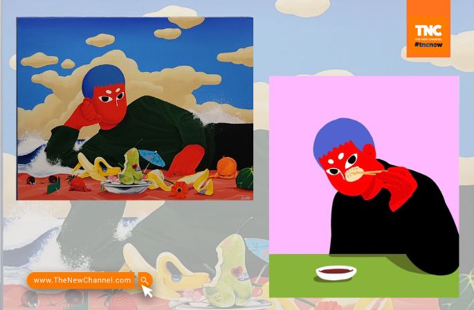 Bolarda’s “Fruit Salad” in acrylic on canvas (left) and a digital illustration from his Instagram (right).